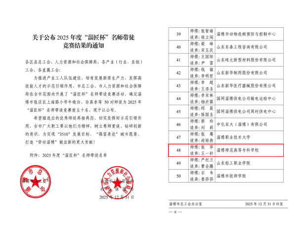 近期,淄博市总工会、淄博市人力资源和社会保障局联合印发《关于公布2025 年度“淄博金牌工匠”“淄博工匠”和“淄博手造工匠”的通知》《关于公布2025 年度“淄匠杯”名师带徒竞赛结果的通知》,我校陶瓷艺术系教师吴琼获评“淄博手造工匠”称号;学前教育学院的结对师徒张萍与王一轩在“淄匠杯”名师带徒竞赛中获评“优秀师徒”。